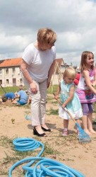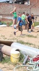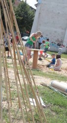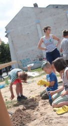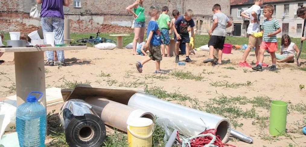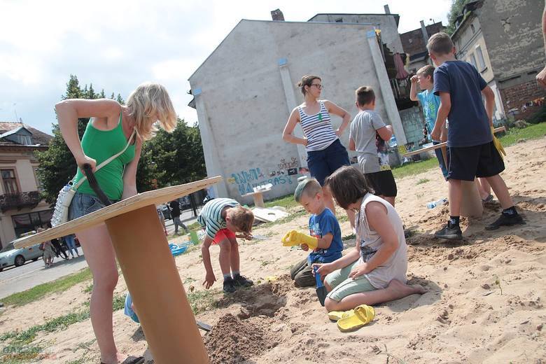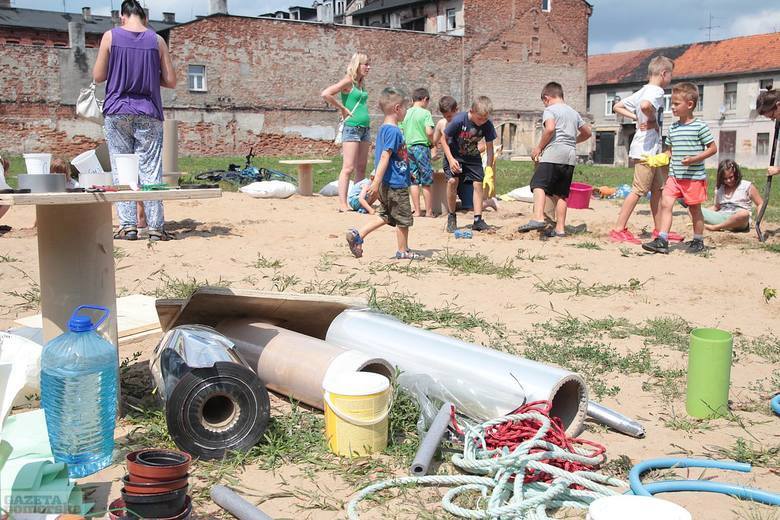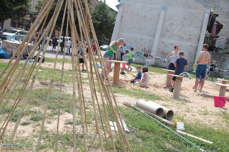 W trakcie dwóch dni animatorzy wspólnie z dziećmi i ich rodzicami, wykorzystując dostępne za darmo lub niedrogie materiały (folie, drewniane elementy i tekturowe tuby — odpadki z fabryki opakowań, stare opony, plastikowe rurki, taśmy, beton, spreje, farby) zbudowali stoliki, siedzenia, kwietnik, namioty. Pobliski chodnik stał się przestrzenią twórczej ekspresji dzieci, podobnie jak malowane farbami duże połacie folii rozciągnięte między drzewami. Dziękujemy firmie PAK Toruń za przekazanie materiałów, które zostały wykorzystane podczas warsztatów. Dzięki uprzejmości firmy Krzysztof Wasielewski Transport-Handel-Usługi na plac przyjechała także wywrotka piasku, który okazał się wspaniałą atrakcją dla najmłodszych.